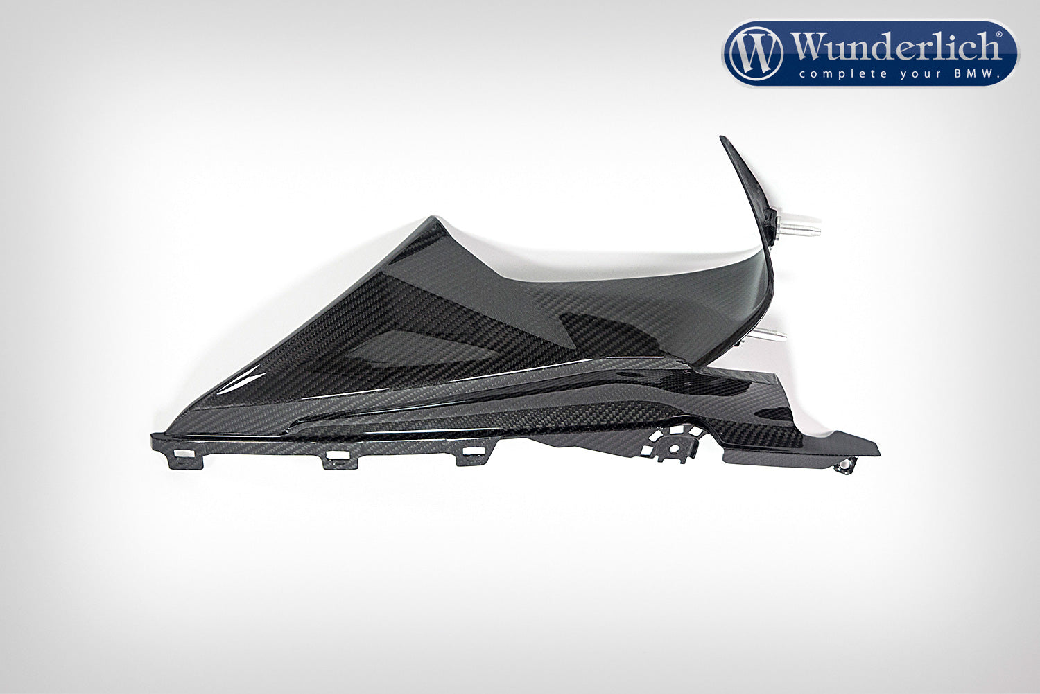 Mit bis zu 70% Gewichtseinsparung gegenüber dem Serienteil und seiner gewichtsspezifischen Steifigkeit entfaltet dieser Space Age Werkstoff sein volles Potenzial. Die Form folgt hier der Funktion und integriert sich optimal in das Design des Motorrades. Die Konturen der Maschine werden ebenso aufgenommen wie Material und Oberflächenstruktur benachbarter Serienbauteile. Dieses Carbonbauteil unterstreicht den Hightech-Anspruch Ihrer BMW mit der einzigartigen Anmutung von echtem Carbon.