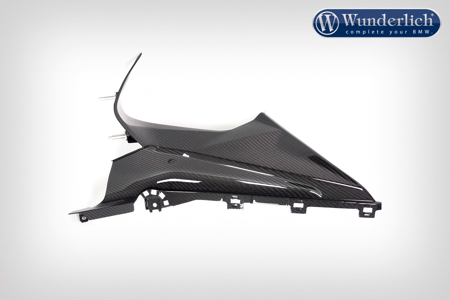 Mit bis zu 70% Gewichtseinsparung gegenüber dem Serienteil und seiner gewichtsspezifischen Steifigkeit entfaltet dieser Space Age Werkstoff sein volles Potenzial. Die Form folgt hier der Funktion und integriert sich optimal in das Design des Motorrades. Die Konturen der Maschine werden ebenso aufgenommen wie Material und Oberflächenstruktur benachbarter Serienbauteile. Dieses Carbonbauteil unterstreicht den Hightech-Anspruch Ihrer BMW mit der einzigartigen Anmutung von echtem Carbon.