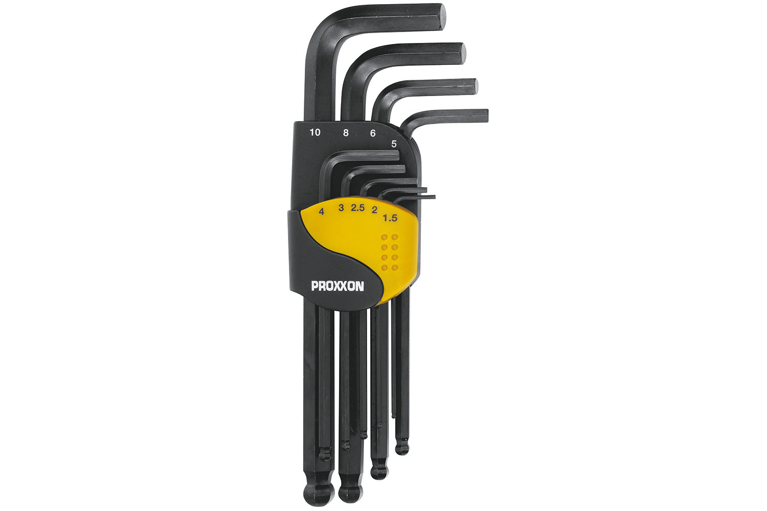 Der „ Inbus “-Satz umfasst Schlüssel in den Größen 1,5, 2,0, 2,5, 3,0, 4,0, 5,0, 6,0, 8,0 und 10 mm mit einer kugelförmigen Oberfläche am langen Ende (das kurze Ende ist abgeschrägt).