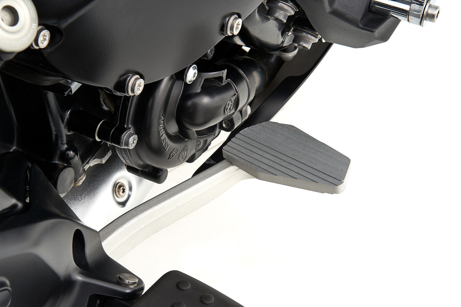 In der Originalform ist die Fußrastenfläche leider recht klein, was allzu oft ein Sicherheitsrisiko darstellt. Liegt der Stiefel zu weit am Rand der Fußraste, muss man ihn umständlich bücken, um an die Bremse zu kommen. Mit diesem Hebelvergrößerer gehört ein Abrutschen des nassen Stiefels von der Hebelspitze oder ein Tritt ins Leere der Vergangenheit an.