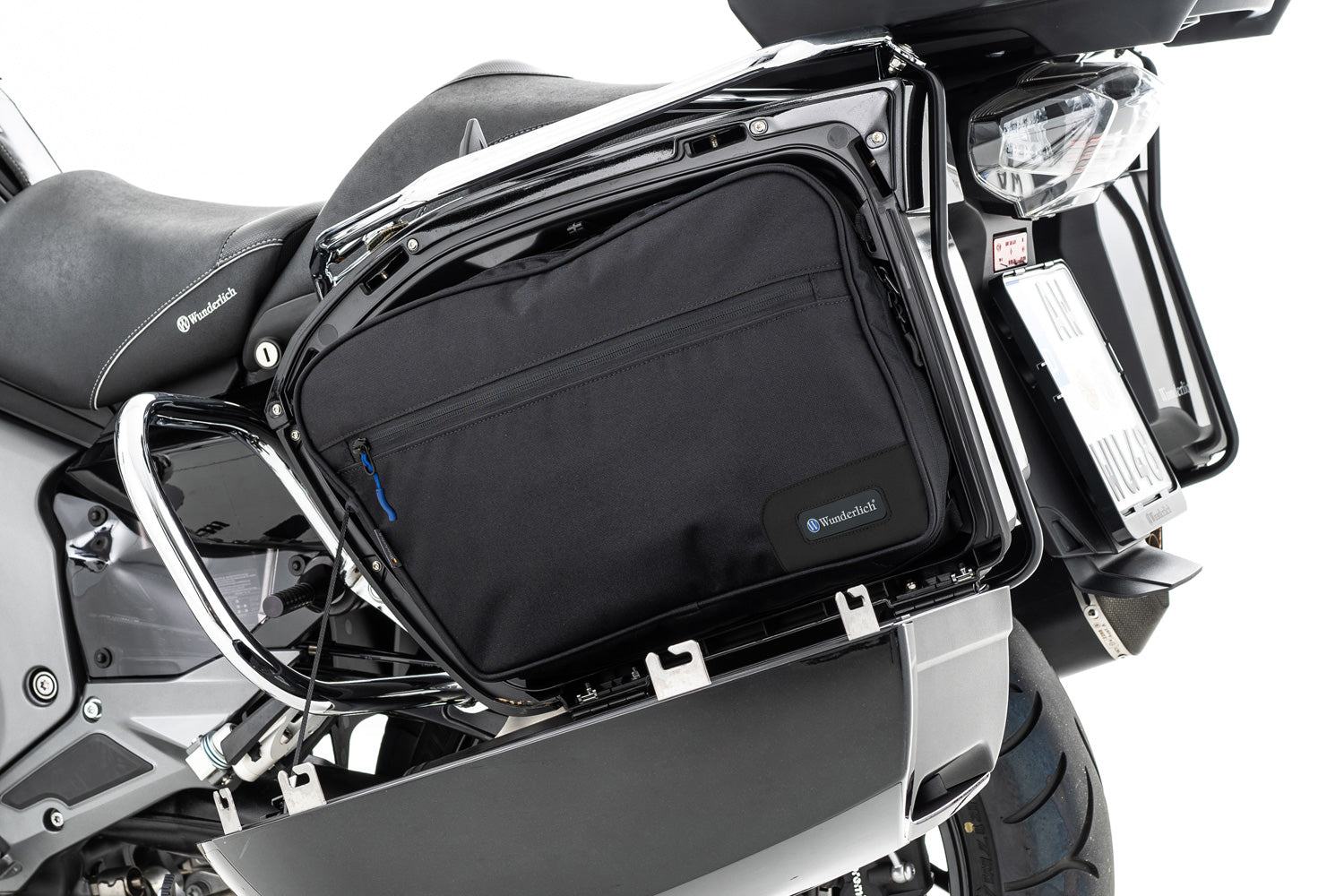 Unsere robusten schwarzen Koffer-Innentaschen sind perfekt verarbeitet und lassen keine Wünsche offen: Ausgestattet mit blauem Innenfutter, verstellbarem Tragegurt und ergonomischem, praktischem Tragegriff sind diese Taschen elegant vormontiert und können auch als handliche Reisetasche verwendet werden. Mit großzügiger Innentasche, die mit Reißverschluss verschließbar ist. Exklusive Koffer-Innentasche für original BMW Koffer sowie Koffer mit ähnlicher Geometrie.