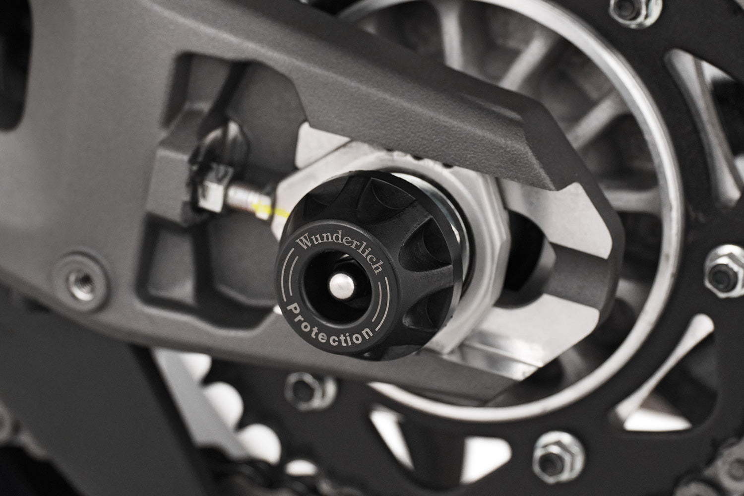 The axle protectors ensure that, in the event of a tip-over or fall, the swingarm, wheel axle, and chain tensioning system are effectively protected from damage.