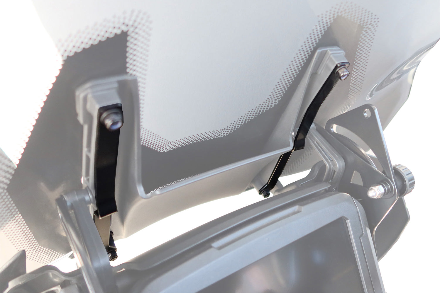 Mit unserer Windschildsicherung, die aus zwei dezenten, schwarz pulverbeschichteten Sicherungsplatten besteht, schlagen wir zwei Fliegen mit einer Klappe: Die beiden präzise gefertigten Sicherungen verhindern, dass sich Windschild und Höhenverstell-Trägergestell von selbst lösen. Sie sind einfach zu montieren und sorgen dafür, dass die oberen Halterungen des Windschildes dauerhaft sicher sind, sich also durch turbulente Windlasten nicht mehr von selbst und unbemerkt lösen können. Zudem verringern sie das Diebstahlrisiko, denn das Windschild lässt sich erst nach dem Abnehmen der Sicherungsplatten abnehmen. Und für deren Demontage wird Werkzeug benötigt.