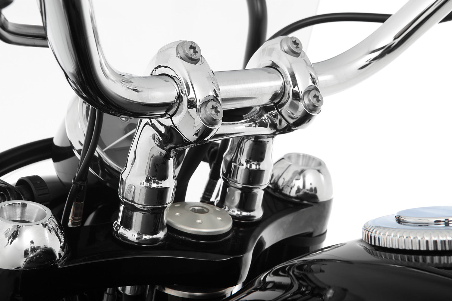 Das Design unserer Lenkererhöhung, die wir aus massivem Aluminium fertigen, fügt sich elegant in den Bereich der oberen Gabelbrücke ein. So wird das Produkt durch die edle Optik der hochwertigen Verchromung zu einem echten Hingucker.