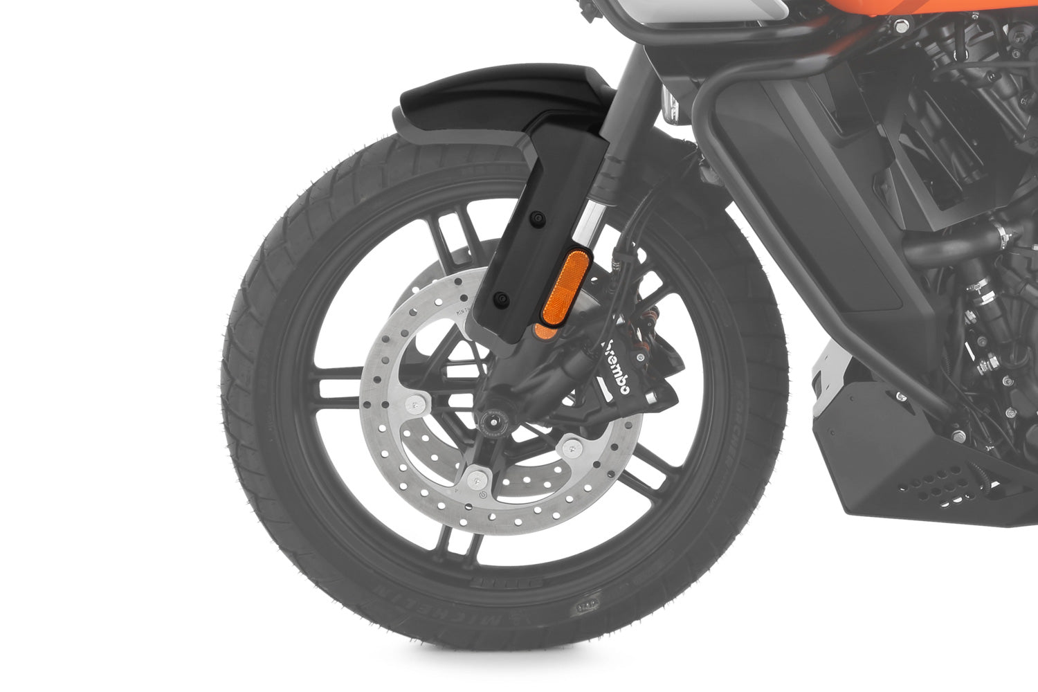 Wird auf der Pan America ein grobstolliger Enduroreifen gefahren, ist der verbleibende Abstand zum Schutzblech recht gering. Schlamm und Steine, die sich bei Endurotouren zwangsläufig auf der Lauffläche ansammeln, bleiben im Inneren des Schutzblechs hängen. Das kann auf Dauer zu Schäden am Schutzblech und im schlimmsten Fall sogar zum Blockieren des Vorderrads führen.