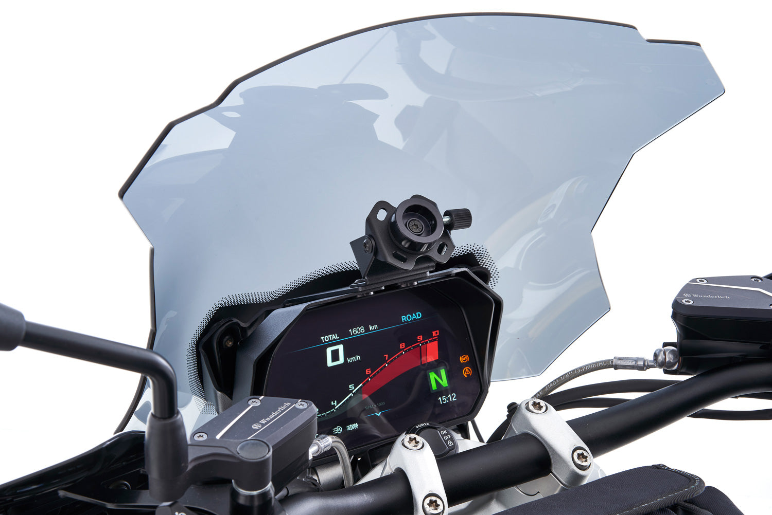 Dies ist die clevere Lösung, wenn es um eine ergonomische Halterung von Smartphone und ActionCam geht und das Smartphone in natürlicher Blickrichtung, beispielsweise bei der Nutzung als Navigationssystem, angebracht werden soll. So hat der Fahrer den Blick immer auf der Straße und gleichzeitig das Smartphone bzw. die ActionCam im Blick. Diese Anordnung ist praxiserprobt und sorgt für einen spürbar höheren Fahr- und Bedienkomfort und erhöht damit die Sicherheit im Straßenverkehr.