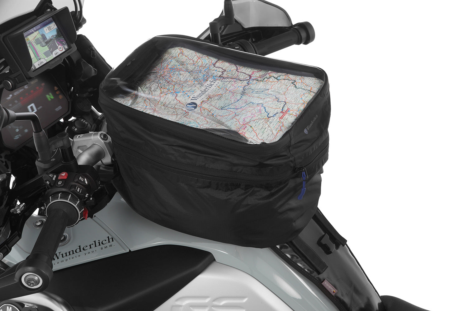 Der Zugriff auf den Tankrucksack ist von oben ohne Abnahme der Regenhaube durch einen umlaufenden Reißverschluss möglich. Das Sichtfenster kann nach dem Öffnen einfach aufgeklappt werden.