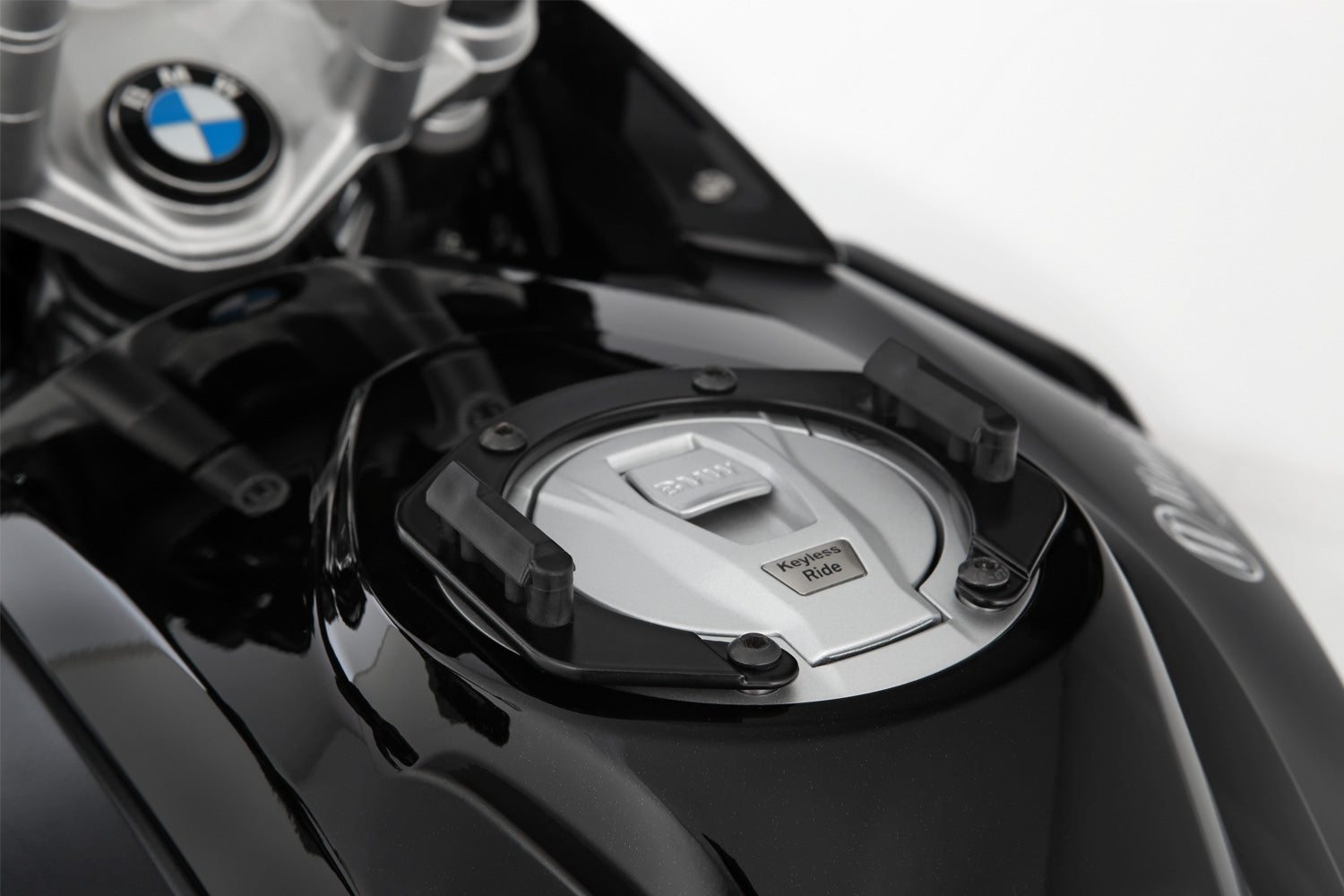 Der sogenannte modellspezifische Tankring bildet die solide Basis für die sichere, mechanische Verriegelung der CLICK BAG Tankrucksäcke. Zur Befestigung des CLICK BAG wird dieser von oben in die beiden Führungen des Tankrings eingeschoben, bis das Schloss automatisch einrastet. Mittels eines Riemens am Tankrucksack lässt sich das Schloss mit einem Zug lösen. So lässt sich der Tankrucksack, z.B. zum Tanken, schnell und einfach abnehmen.