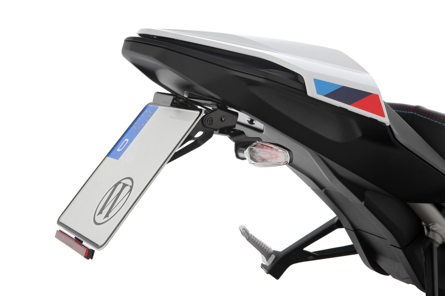 Nach der Demontage des originalen Kennzeichenhalters bleibt unterhalb der Sitzbank eine faustgroße Öffnung, die von einer schalenförmigen Abdeckung, die im Lieferumfang des Kennzeichenhalters enthalten ist, dauerhaft verschlossen wird. Sie bleibt auf der Straße und im Renneinsatz an Ort und Stelle und fungiert gleichzeitig als Basis für unseren abnehmbaren Kennzeichenhalter. Darüber hinaus bringt der Kennzeichenhalter »TRACKDAY« alle typischen Features eines Wunderlich-Kennzeichenhalters mit: Der Winkel des Kennzeichens ist einstellbar und die Aufnahmen für die originalen Blinker sind vorbereitet. Abgerundet wird das Ganze durch eine dezente LED-Kennzeichenbeleuchtung mit E-Prüfzeichen.