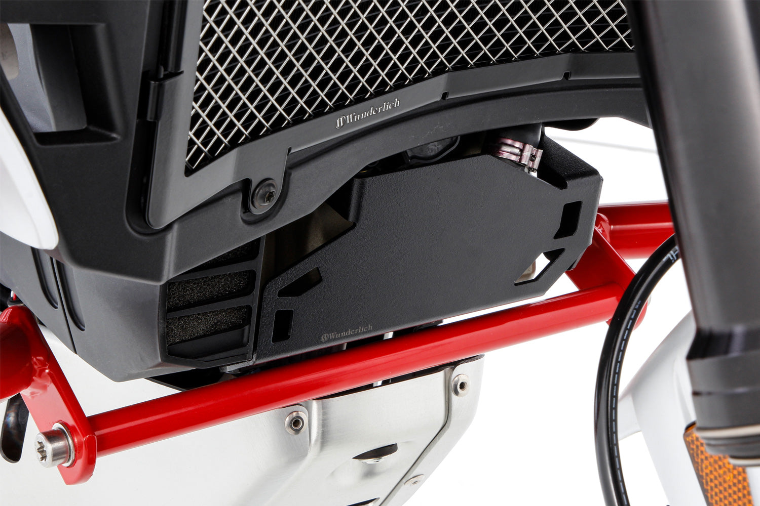- Schützt den Zylinderkopf mit dem Ventildeckel, unter dem sich die technisch aufwendige desmodromische Ventilsteuerung befindet, die Zündkerze und die Zündspule des vorderen Zylinders, die ungeschützt zwischen Motorschutz und Kühler herausragt