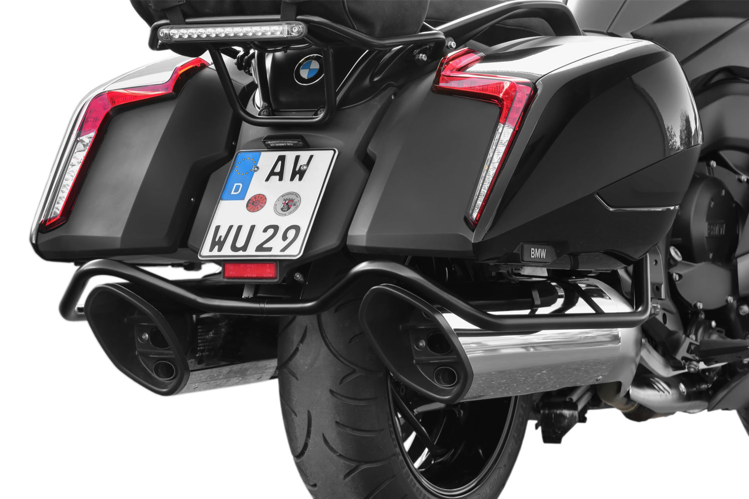 Deze beschermbeugels voor de koffers zijn gebaseerd op het unieke ontwerp van de K 1600 B en worden onder de koffers geleid. Ze integreren visueel perfect en breiden de veilige bescherming van de zware K 1600 B/Grand America uit naar de achterkant van het voertuig. De prominente koffers raken bij een slip heel snel beschadigd, maar deze beugels beschermen betrouwbaar tegen dure reparaties.