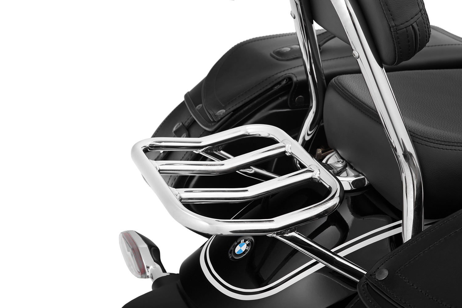 Als je met z'n tweeën op pad bent, neem je ook bagage voor twee mee! Deze discrete maar zorgvuldig ontworpen bagagedrager bergt het voor je op. Tassen of andere reisbagage kunnen op een cruisevriendelijke manier worden opgeborgen en stevig worden vastgezet. Het volledige potentieel ervan komt tot uiting in combinatie met onze zij- en zadeltassen - of die van BMW - en het biedt ruimte aan extra bagage. De handige plaatsing dicht bij het zwaartepunt ondersteunt de royale, neutrale rijstijl van de BMW R 18.