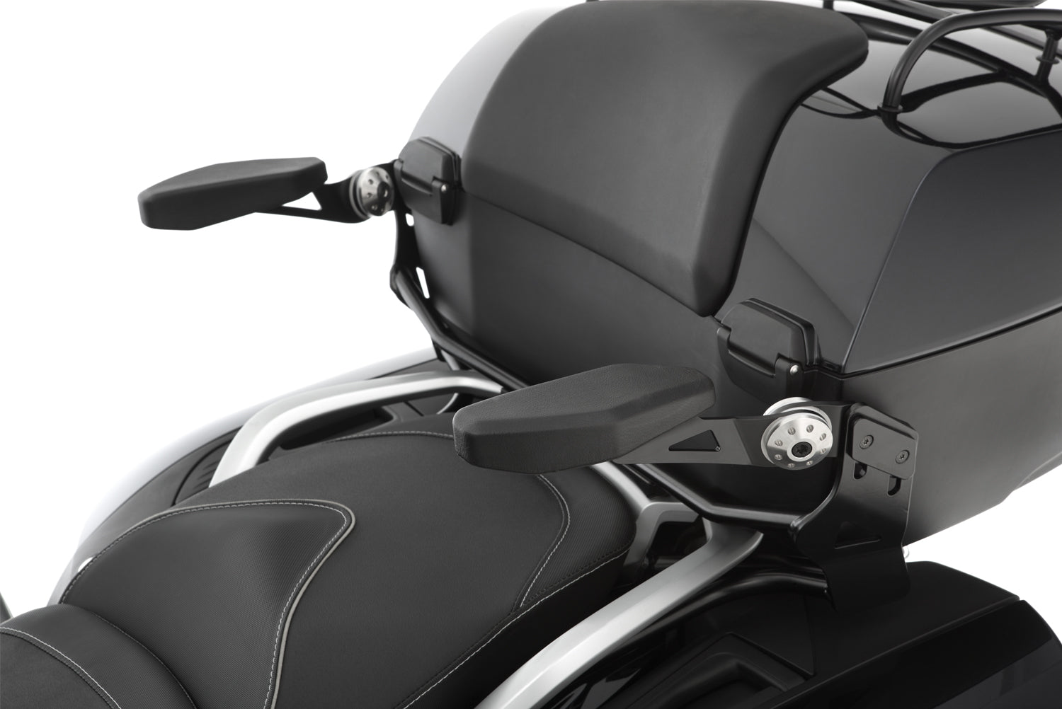 Onze armleuningen bieden reiscomfort en ergonomie, evenals maximale veiligheid door extra zijdelingse ondersteuning. De armleuningen zijn traploos aan te passen aan uw persoonlijke wensen: u kunt de breedte, hoogte en hoek aanpassen. Ze klappen weg, zodat u ze eenvoudig kunt opklappen, bijvoorbeeld om comfortabel op te klimmen. De armleuningen kunnen ook tijdens het rijden op elke gewenste manier worden gebruikt. Het gewricht is gemakkelijk bereikbaar. U kunt de topkoffer zoals gewoonlijk zonder beperkingen gebruiken en deze hoeft niet te worden aangepast om de armleuningen te monteren.