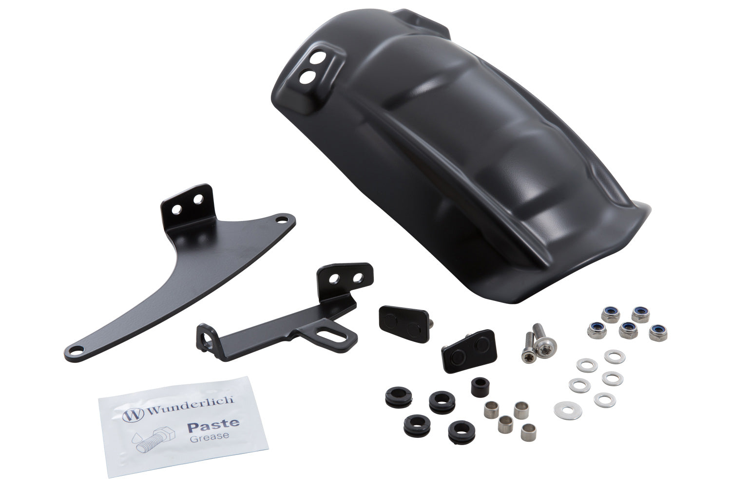 Deze spatbescherming beschermt de schokdemper, die sowieso al zwaar genoeg getest is in gebruik, samen met schokdemperbevestigingen, swingarm, collectorbuizen en de achterkant van de versnellingsbak. De hoeveelheid water die op de voeten/onderbenen van de duopassagier terechtkomt, wordt permanent verminderd. Naadloze overgang van de ingewikkelde swingarm