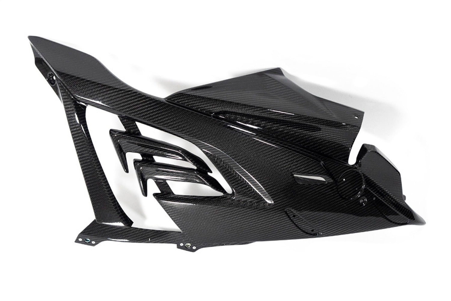 This space age material unfolds its full potential with up to 70% weight decrease compared to the standard part and its weight-specific stiffness. Form follows function here and integrates optimally into the design of the motorcycle. The contours of the machine are incorporated as well as the material and surface texture of neighbouring series components. This carbon component underscores the high-tech claim of your BMW with the unique appeal of real carbon.