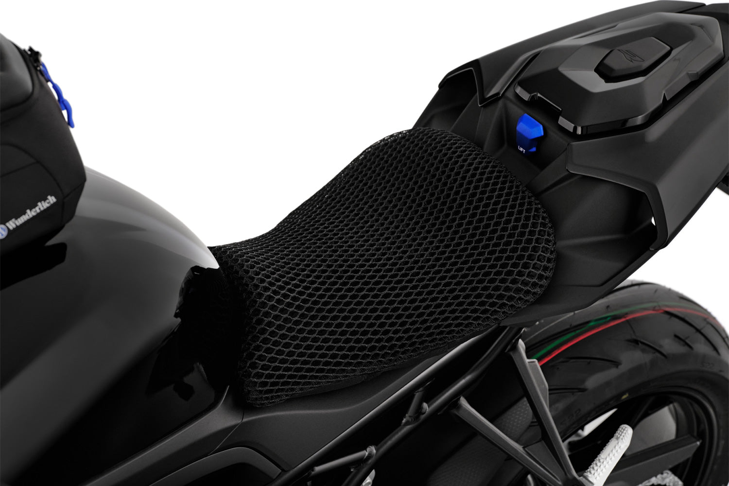 This seat cover is the climate control for your original BMW bike seat. The air can circulate while riding because the cover is constructed in three dimensions and is eight millimetres thick. It doesn't completely compromise even with a lot of weight: Not only is the air permeability assured, but the seat even stays dry in the rain. The Cool Cover also doesn't heat up in sunlight. An additional benefit: It creates an effect resembling a massage and thus reduces the symptoms of tiredness.