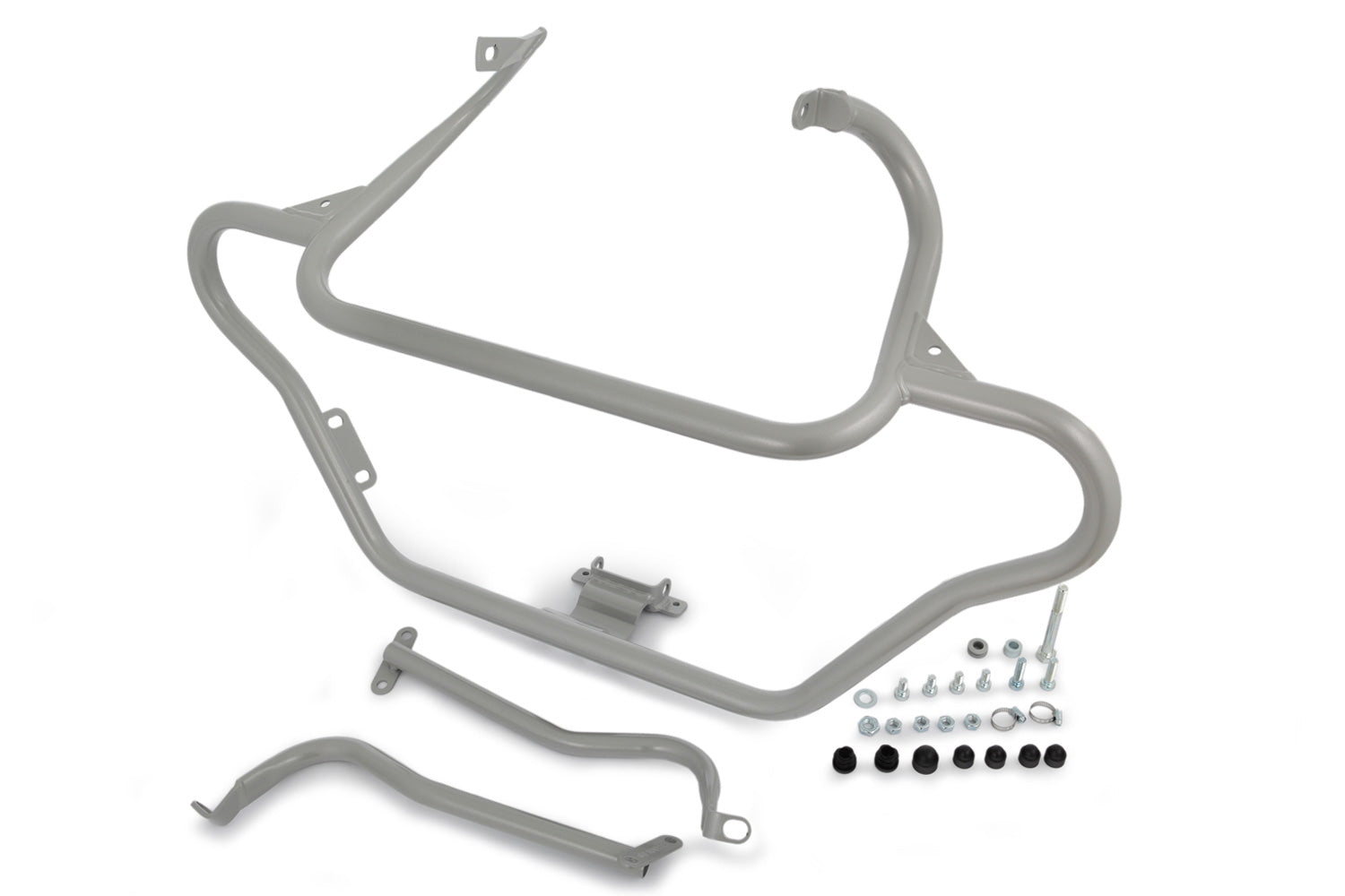 The protection bars form a cohesive line with the cylinders and exhaust manifolds. The protection bars are not foreign objects but integrate perfectly. All mounting points are designed for both tensile and compressive loads. In the event of a fall, the leverage forces are distributed across all six mounting points. The central bracket ensures even distribution and acts like a pivot, which, in the event of an accident, evenly involves all other mounting points in absorbing the forces.